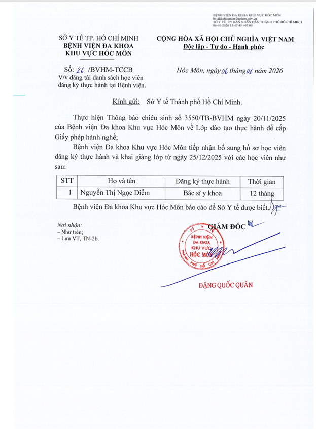 DANH SÁCH HỌC VIÊN ĐĂNG KÝ THỰC HÀNH TẠI BỆNH VIỆN ĐA KHOA KHU VỰC HÓC MÔN Facebook twitter google linkedin